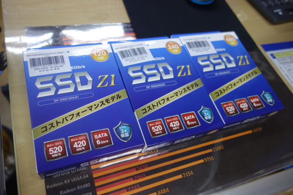 ドスパラ秋葉原本店では同社オリジナルの2.5インチSSD「Z1」シリーズが売り出されている。480GBモデルが税込み8980円、240GBモデルが同5580円、120GBモデルが同3480円と、週末特価の目玉クラスの安さを実現している。